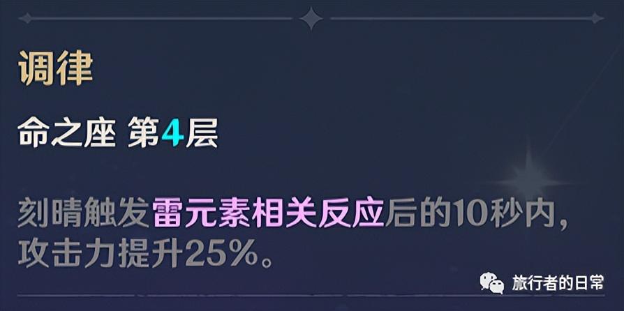 4命:刻晴触发雷元素反应后10秒内提升25%攻击力,提升有,但是相对4命的位置来说,确实少了点