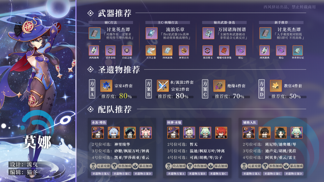 3.实战中莫娜常作为辅助增伤角色入队,当然也可以围绕着主C莫娜水爆进行配队