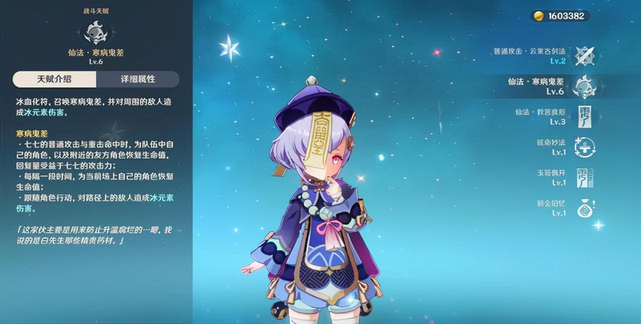 七七的回血方式有两种,一种是释放战技后,用七七普攻目标即可为全队回血;另一种是在七七开大后,会为一定范围中目标挂上标记符,攻击被标记的目标既可以回血。因此,想让七七奶量完整充足、空档期短,玩家们就应当同时提升七七的战技与大招。除了回血,七七的技能还有较好的挂冰能力。