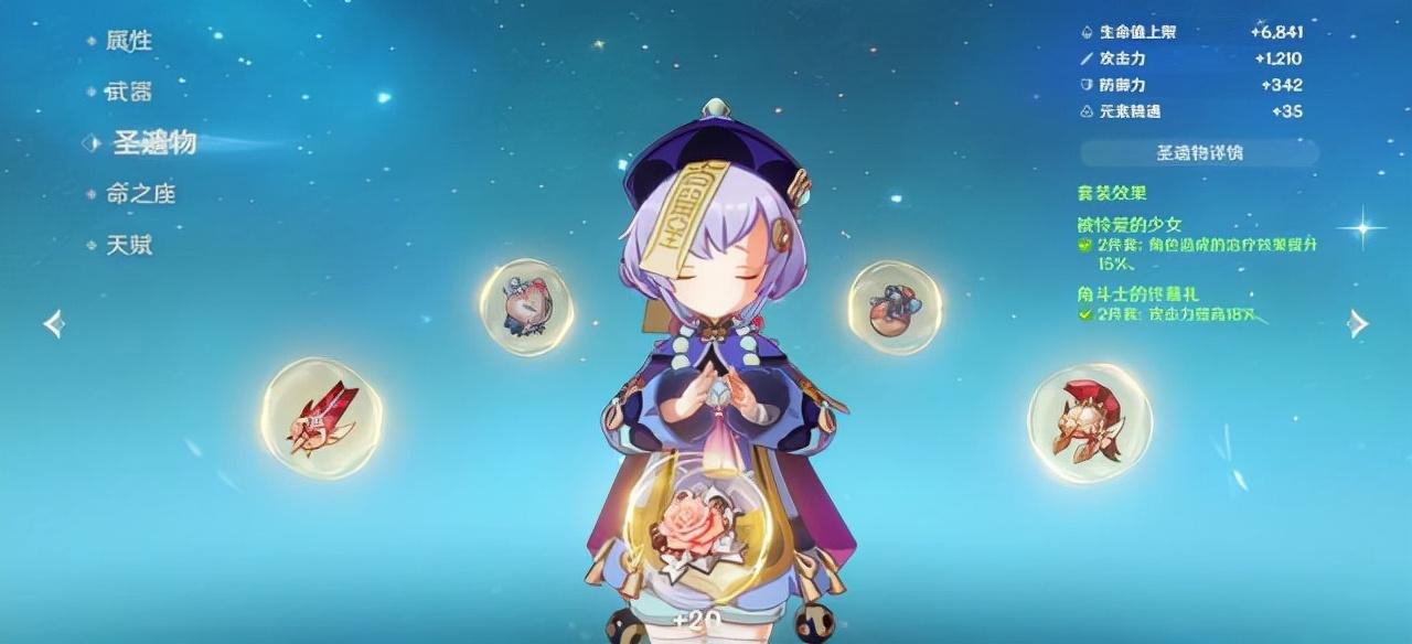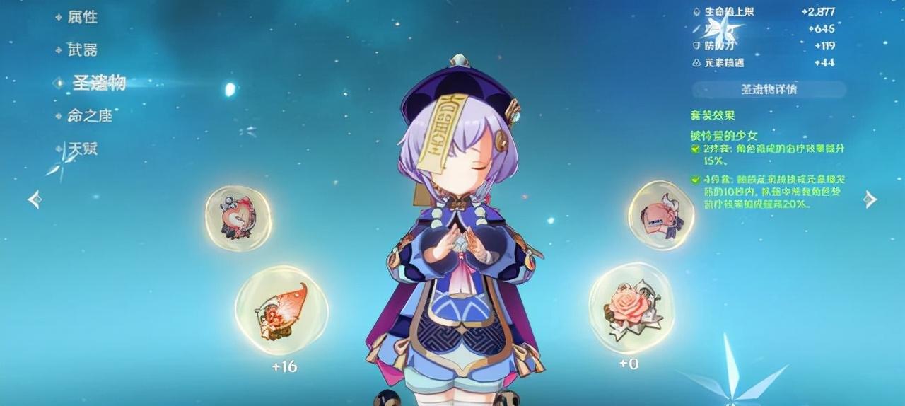 无论是战技还是大招,无论七七平A主动回血还是其他角色攻击标记来回血,回复量都与七七的攻击力相关,所以在选择其圣遗物词条时首先要以攻击力加成为主。使用攻击力较低的武器时,七七可以选择两套角斗士和两套少女套,同时加成攻击力与治疗加成;使用高攻击力的武器则推荐四件少女套,能大幅提升治疗加成。