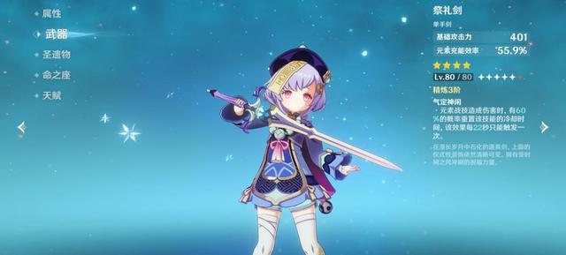 七七的武器选择需要兼顾功能性和攻击力。武器的功能要满足充能效率提升,在众多充能单手剑中,祭礼剑堪称最优解。高精炼祭礼剑可以高频刷新七七的战技,从而使奶量无间断。倘若采用五星高攻击力单手剑,例如攻击力白值最高的风鹰剑,七七的奶量可以更上一层楼。