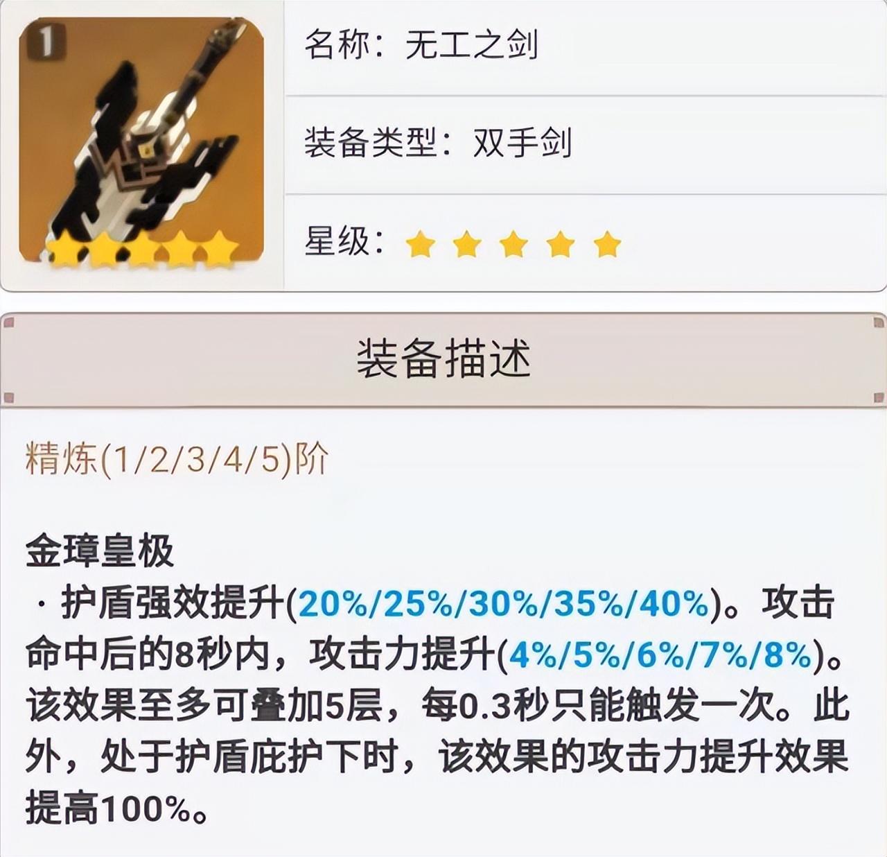 这把武器护盾强效加20%和20%攻击加成,在护盾下还会提升100%,所以在有护盾角色的情况下这把武器是很不错的选择。