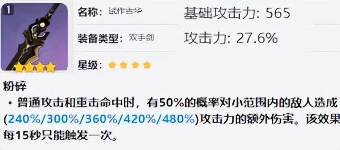 试作古华作为锻造武器,获取方便,属性又好看,非常实用,是四星中性比价最高的一款,尤其推荐0氪党使用。