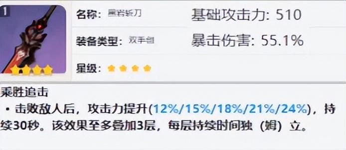 这把武器的属性值挺好看的,黑岩的副词条是暴击伤害加成,与螭骨剑有些类似,同样可以减轻对圣遗物的压力且有较高的增伤效果,黑岩的技能面对群怪非常有力,击败敌人后,会提升攻击力12%,可以叠加三层,持续三十秒,但是也有不足之处,就是面对boss会略显乏力,武器被动比较难触发。