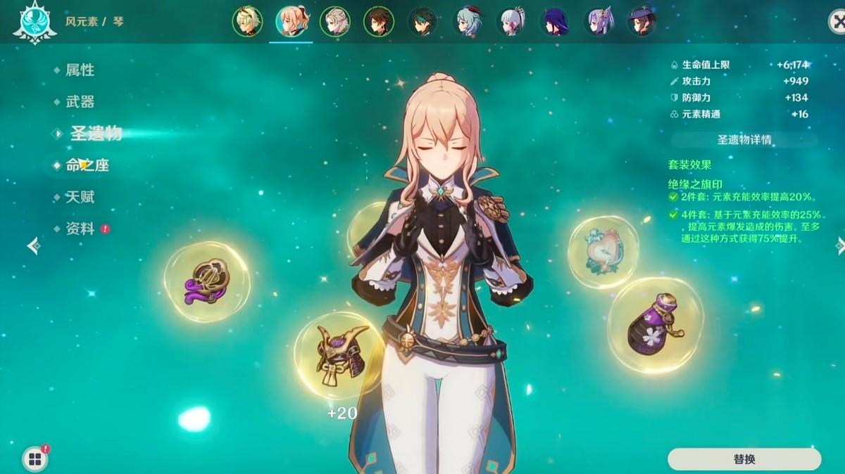 然后是绝缘四件套,其实在原神2.0改版前,我就非常看好这套圣遗物了,2件套的充能20%、4件套的元素爆发增伤,简直是亟需元素充能效率,且元素爆发倍率高的琴的福音。且元素充能的基础值是100%,因此不管你有没有撑充能词条,都一定保底有25%以上的元素爆发加成,而绝缘四件套,也从开服至今,主C琴最适合的圣遗物了。不过要使用绝缘套打出高伤害,爆击/爆伤绝对不可少,因此圣遗物词条比较难刷。
