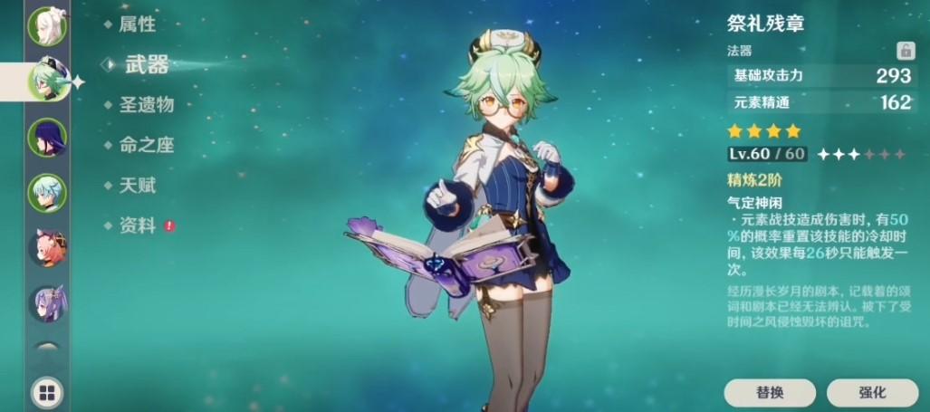 砂糖作为元素反应辅助时,武器首选祭礼残章,次选魔导绪论和万国诸海图谱。祭礼残章拥有高额元素精通加成,且可刷新元素战技,是首选毕业武器。魔导绪论虽然是三星武器,但其满级后可以提供187元素精通,大于万国,而且对于水雷影响下敌人有伤害加成,适合砂糖武装。砂糖只需要元素精通,是否五星武器并不重要。