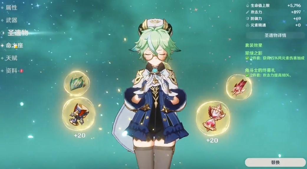圣遗物的话,最优解是4风套,不仅增加风元素伤害,且在进行扩散反应时,还会再次提升时候以及降低敌人的元素抗性。