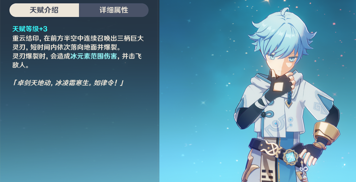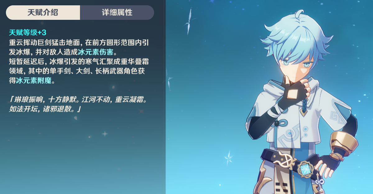 元素战技“灵刃·重华叠霜”对前方圆形范围造成冰元素伤害,短暂延迟后,会为范围内的单手剑、双手剑、长柄武器角色提供冰附魔。在解锁了固有天赋“吐纳真定”后,还会为该领域内的单手剑、双手剑、长柄武器角色再提供8%普攻的攻速,另一个固有天赋则是在领域消失时多一段冰元素范围伤害,且降低被击中敌人10%的冰抗(持续8s),如果你的重云有二命的话,还可以再加上一个在领域内释放元素战技与元素爆发减少15%cd的效果,一个元素战技塞了这么多作用,也是不容易。