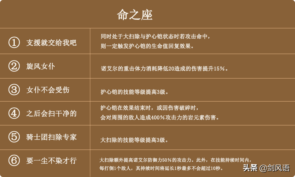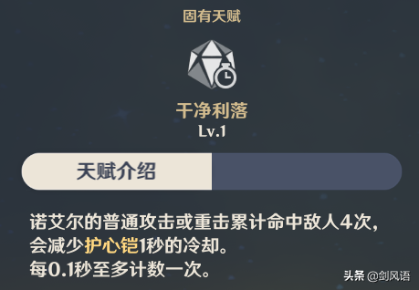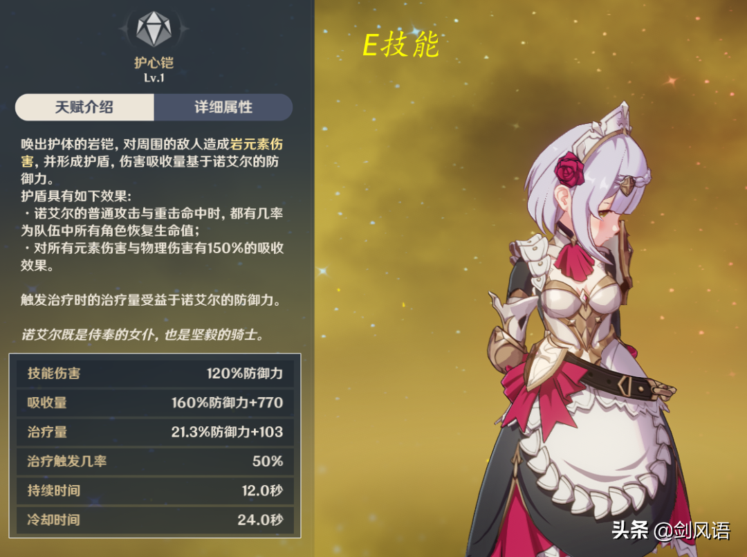 1.护盾持续时间12秒,冷却时间24秒,解锁了固有天赋5「干净利落」,普攻和重击减少E技能冷却时间,在实战中,真空期也有5-8秒,覆盖率有点低,不过除了护盾外,普攻和重击都能概率触发回血效果。而诺艾尔又是堆防御力属性,因此基本不用担心生存问题,这是诺艾尔站撸的本领。