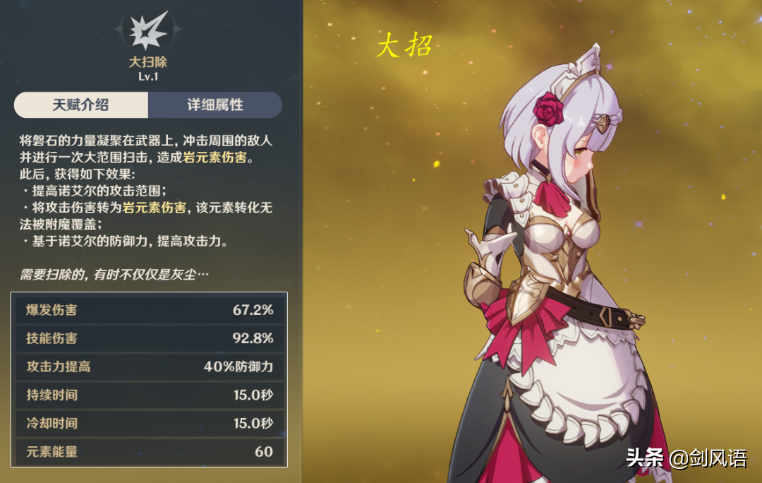 3.大招是锁面板机制,基于防御力提升成攻击力,由此诺艾尔主要叠防御力属性,如武器和圣遗物有防御力被动效果的,记得先叠满被动后再开大招,不然吃不到该效果,开启大招持续时间打的是普攻伤害,因此普通攻击培养也很重要。