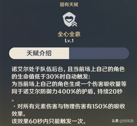 4.固有天赋「全心全意」,诺艾尔处于后台,当前角色生命值低于30%时,生成一个诺艾尔防御力400%护盾,打辅助非常适用。