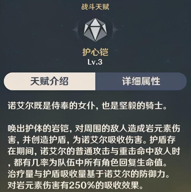 护心铠的数值是由诺艾尔的防御绝定的,技能有12秒的持续时间,CD为24秒,护心铠在对阵岩属性的敌人时,效果会更好!