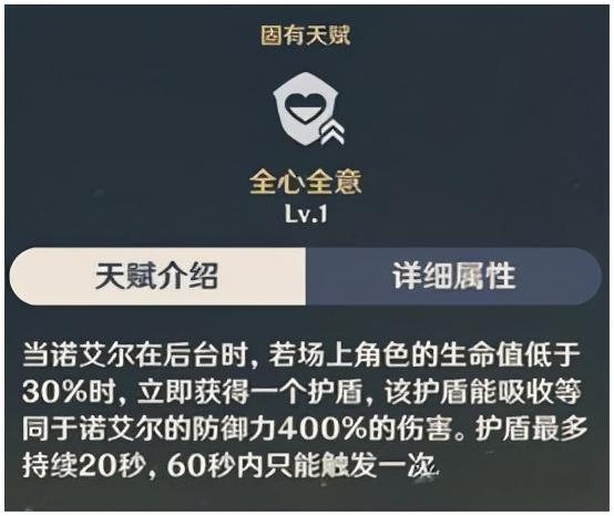 诺艾尔在一破后,可以解锁全心全意天赋,当诺艾尔在后台时,如果上阵角色生命低于30%,可以立刻获得一个护盾,防止暴毙;