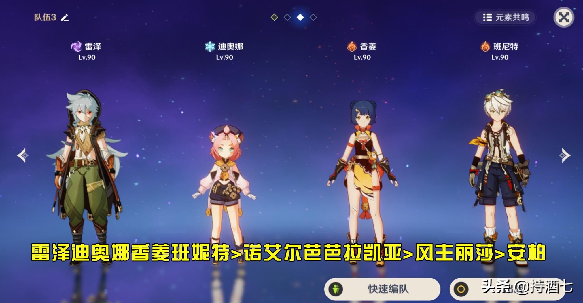 终极四星阵容,我一直用到90级:雷泽、迪奥娜、香菱、班尼特。