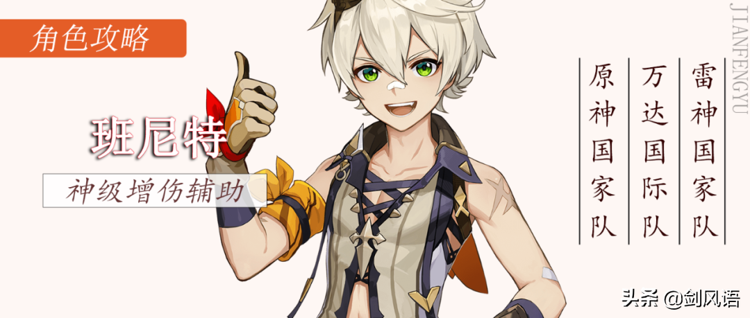 班尼特神级增伤辅助,基本上可以搭配任何主C角色,其中当然和火元素主C搭配最佳,双火组合共鸣增加队伍25%攻击力。增加攻击力同时还能充当奶妈角色,任何队伍都可以带上他,太多就不一一赘述了,主要说说以班尼特为核心的国家队,以及国家队的延伸。