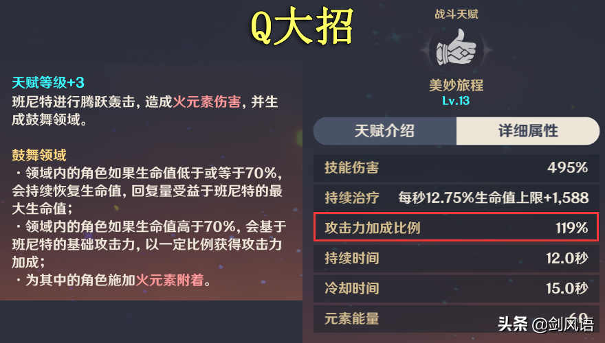 1命,大招增加攻击力没有量生命值限,同时增加20%基础攻击力,即是提升班尼特增伤效果,性价比极高。
