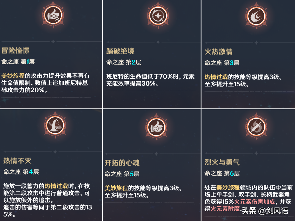 PS:6命,当前角色获得火元素附魔,该效果对火元素以外角色负收益,虽然大部分角色附魔是不可覆盖的,但还是慎重考虑。