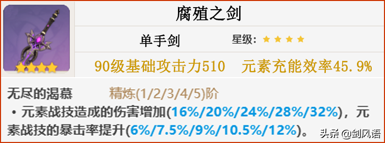 天空之刃:有比较高的基础攻击力面板,同时副属性是增加元素充能效率,非常契合。