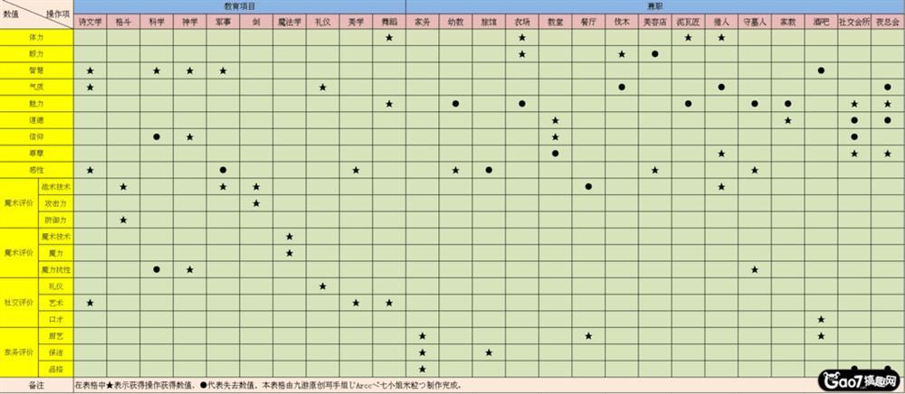 教育项目:诗文学、格斗、科学、神学、军事、剑、魔法学、礼仪、美学、舞蹈