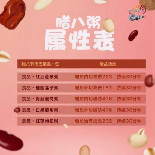 与此同时,侠士们熟悉的腊八节活动与龙门绝境等福利机制在今年也将继续与侠士们见面,而随着新赛季的开启,侠士们制作的腊八粥属性也将得到了大幅度的提升,以此匹配侠士们的实力。