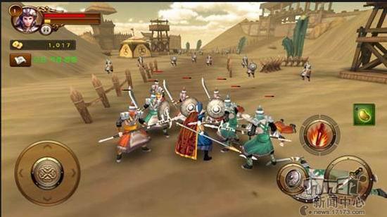 最右边的一排按键则是特殊技能,当五次连击蓄满能量后则可发动超大威力的特殊技能。特殊技能的名字非常酷炫,比如赵云的技能:紫魂龙舞,技能的衔接不错,释放起来比较流畅。特殊技能需要在游戏里赚取金币购买。与一般动作手游不同的是增加了防御系统,需要一定的预判能力来判断敌人的攻击时间来抵挡敌人的攻击没,防御可以格挡攻击但仍然会造成细微的伤害(参考街机游戏《拳皇97》),敌方小兵分为三种:刀盾兵(防高攻低)、弩兵(远程攻击)和戟兵(攻高防低),不同兵种之间还存在一些配合,比较有新意,唯一不足的是士兵的AI比较低,攻击的时间间隔较长,存在一些瑕疵。