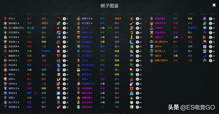 棋子分类:通过购买棋子时的花费,以及招募所需等级分为5类棋子。花费的金币越多的英雄总体上相对来说越强。