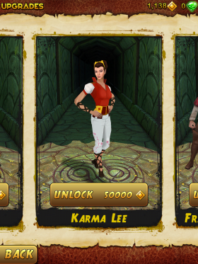 《神庙逃亡2》沿用了上一代技能和金币解锁元素,玩家只要在游戏的过程中收集足够的金币即可以使用出角色的特有技能,譬如短时间的无敌或者加速逃跑等。除此以外,玩家也可以在逃走的沿途上吃到这些技能。还有完成每次等级设置的任务,就可以使基础分往上乘,这样破纪录的欲望就更大了。游戏现在共有8个角色,其中7个角色都是利用金币来解锁,新版本还加入了飞人博尔特,想不想跟飞人一起跑到大城市呢。