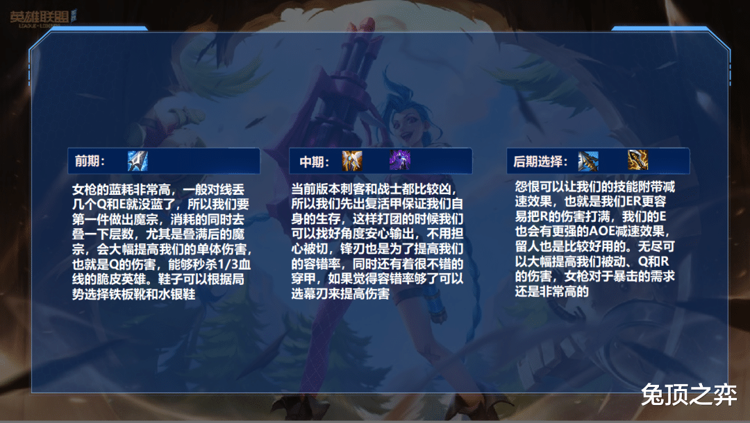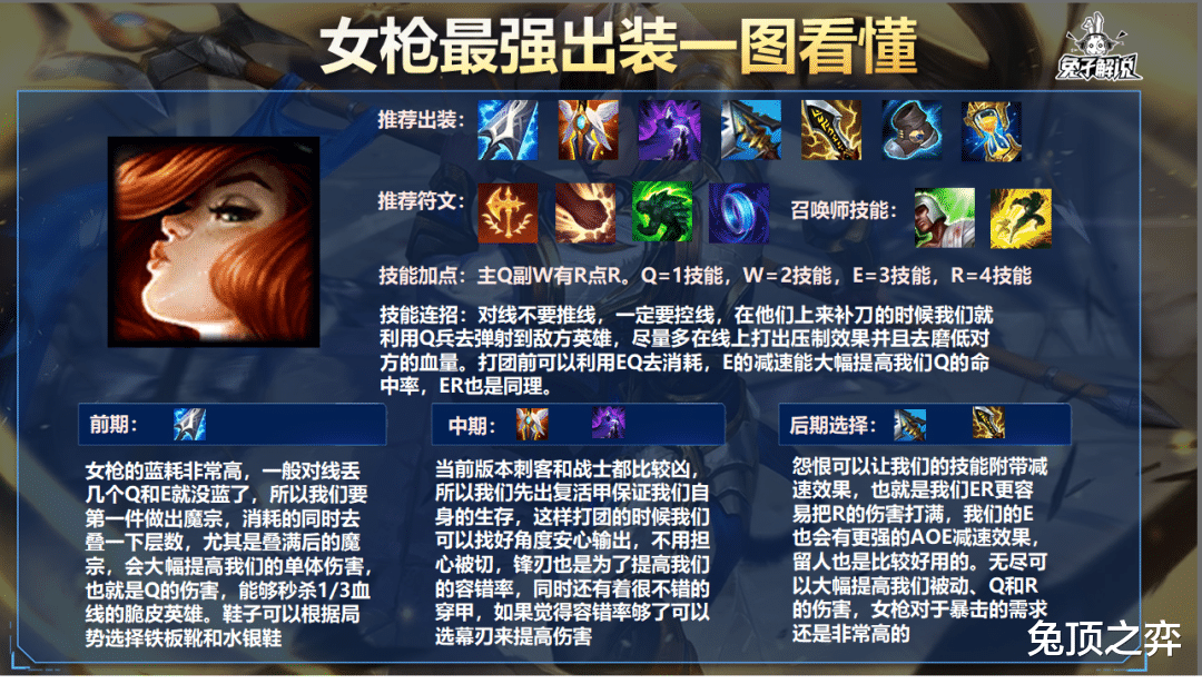 由于女枪没有位移和保命手段,非常容易被针对,所以我们优先考虑到自身的存活,女枪的伤害即便没装备也是很高的,所以前期可以不用考虑输出,因为我们有R的原因,所以输出是够够的。