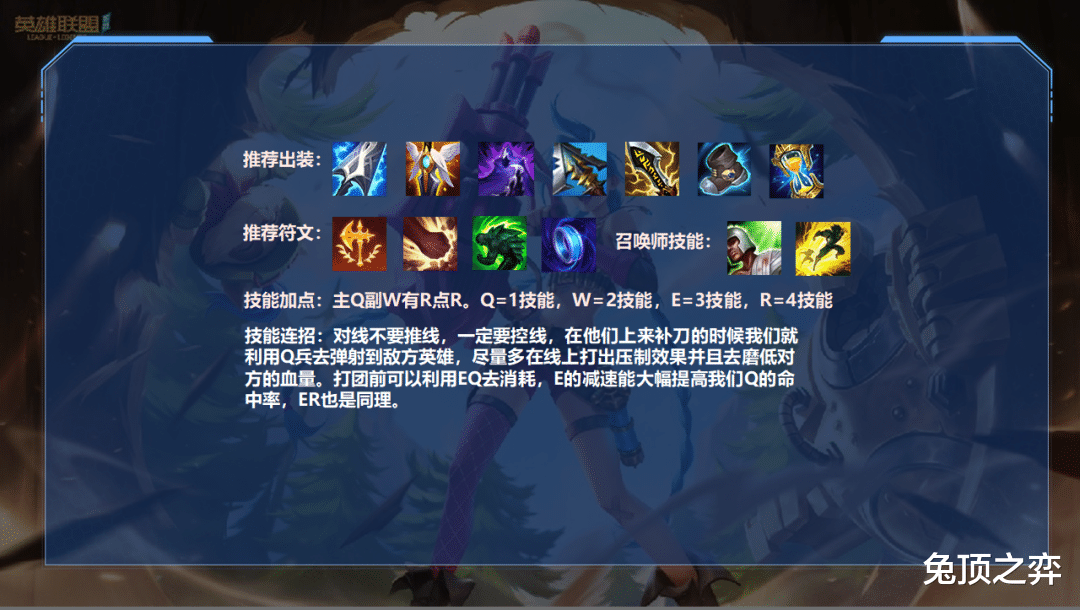 对线不要推线,一定要控线,在他们上来补刀的时候我们就利用Q兵去弹射到敌方英雄,尽量多在线上打出压制效果并且去磨低对方的血量。打团前可以利用EQ去消耗,E的减速能大幅提高我们Q的命中率,ER也是同理。