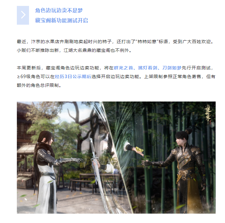 账号中介的存在,虽然一定程度上方便了玩家们又想卖号又想继续玩的心态,但是却因为人为的逐利思维,导致处了许多乱象。许多在黑中介处吃过亏得玩家,也因此喊话游戏官方,希望可以推出更加人性化的藏宝阁服务。而看到了玩家们的需求之后,《逆水寒》的官方也对自己的藏宝阁系统进行了进一步的优化升级,推出了角色边玩边卖功能,彻底颠覆了此前上架后就不能再登陆的僵硬模式,对行业潜规则进行了颠覆。