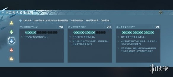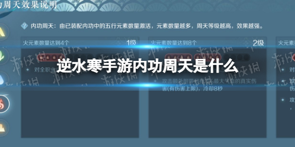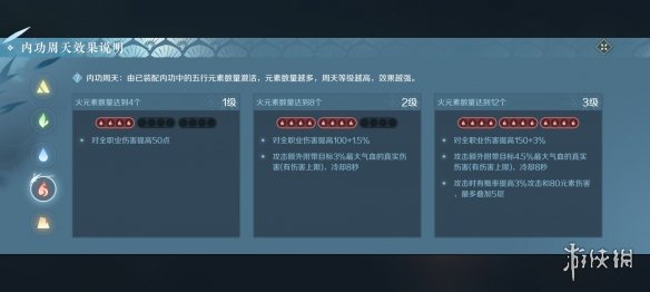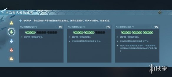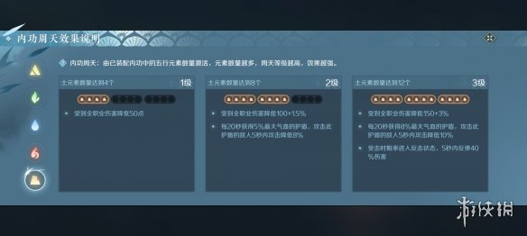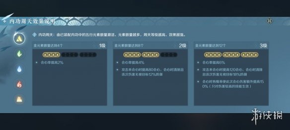 由已装配内功中的五行元素数量激活,元素数量越多,周天等级越高,效果越强。