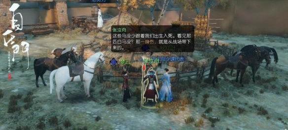 首先,既然是碧血营专属任务,那么触发点就是在碧血营内,这个是毫无疑问的,所以小萌在其地点对所有NPC点击对话,终于在碧雪营坐标:540.664该地方发现了一个与众不同的地方,那就是张汝舟NPC为何黄字标注旁边白马受伤了?于是以往的触发方式思维,小萌对白马使用了包扎伤口动作,结果一次性触发奇遇成功。