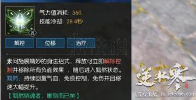 最后一个是蝶恋花-初见回气力的技能,CD非常短是一个为各位素问玩家节约药钱的重要技能,没有前置机制,等CD好了可以无限释放。