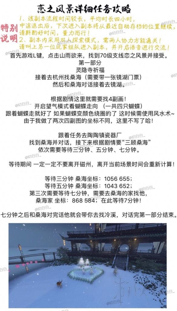 在70等级开放之后游戏里自然也就迎来了很多的新任务,其中恋之风景这个探索任务是需要双人搭配才能完成的,下面就让我们来看看这篇“幼白白”分享的逆水寒恋之风景任务攻略吧。