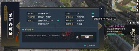 一番介绍后,矿业司签发了你的采矿许可证,需要你签字确认。签字成功后,即可获得一张采矿许可证,同时获得一个绑定的矿权编号(即区块链账号地址)。