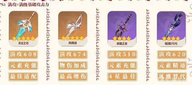 在保证大招能够循环的情况下,选择基础攻击力最高的武器!如风鹰剑,天空之刃等
