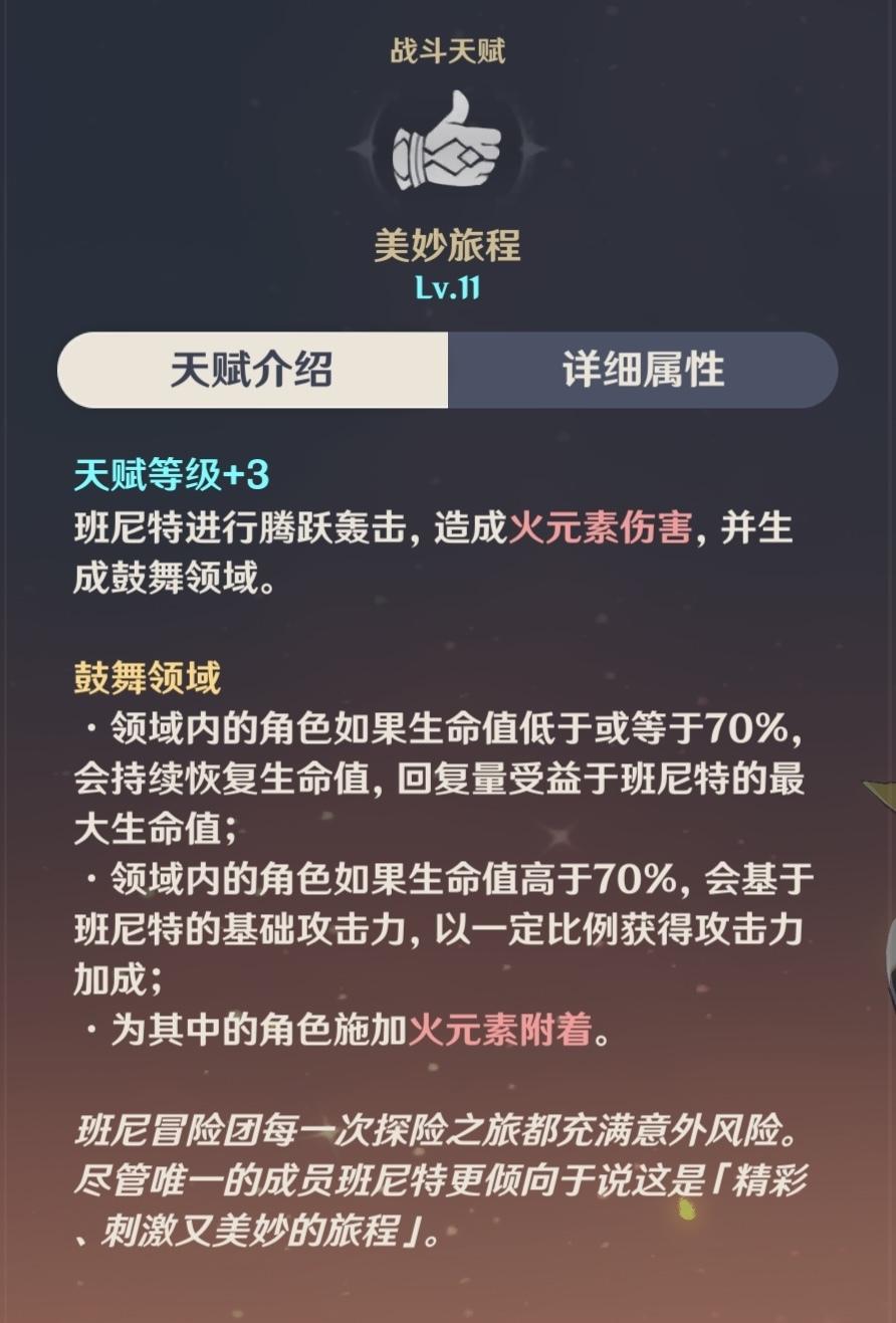 作为六星战神,我们的班尼特可以塞到任何一支队伍里使用(胡桃和永冻队可能不太适合),总之,练就对了,用就对了!毕竟可以给队友加很多的攻击力和大量的回血呢~