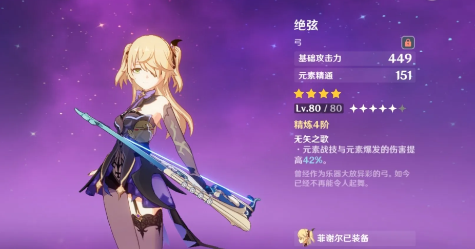 菲谢尔的武器与圣遗物选择比较单一,五星武器首选若水,能够提高菲谢尔后台挂雷伤害以及暴击伤害面板,次选天空之翼,可以大幅度提高暴击率与攻击面板。四星武器首选绝弦,大幅度提高菲谢尔的技能伤害,完美适配挂雷副C菲谢尔,次选暗巷猎手,提高菲谢尔后台伤害,三星武器可以选择鸦羽弓过渡。