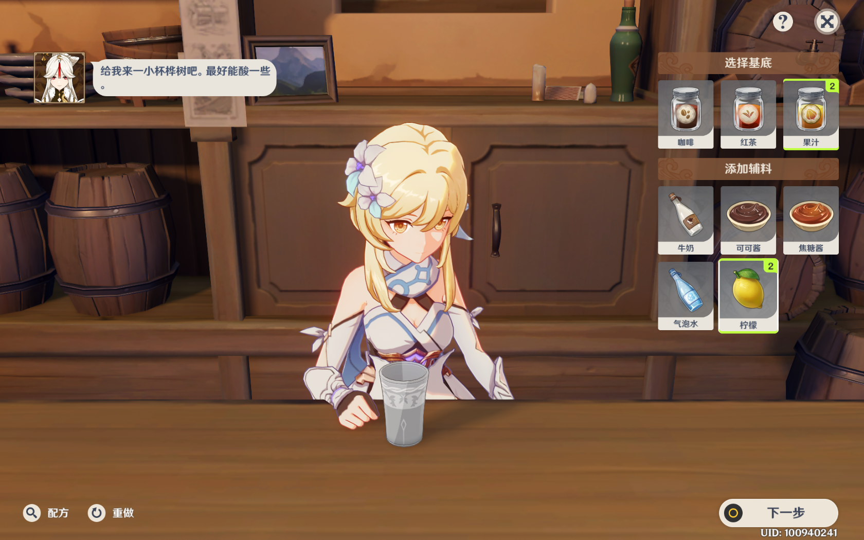 凝光:配方2果汁+2柠檬,小杯的,但量也别太少,太少时会提示完成但不会说做得很棒。