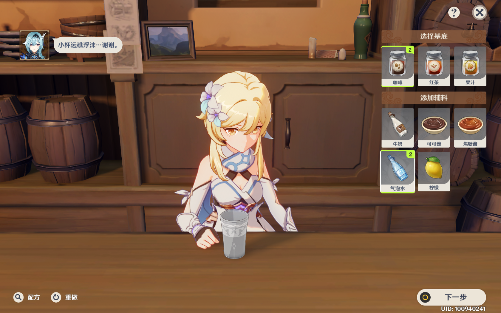 优菈:配方2咖啡+2气泡水,这边的提示是在剧情时的,如果漏掉的小伙伴可能配方就会出错了,需要注意,另外杯量是小杯。