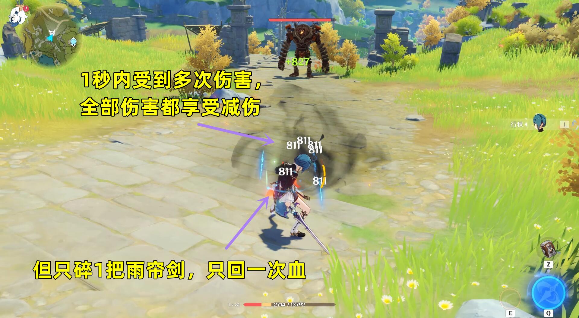 举个例子,角色身上存在4把雨帘剑时,遗迹守卫发射6枚导弹,如果6枚导弹在1秒内命中,则只破碎1把雨帘剑,但6次伤害都会享受减伤效果。
