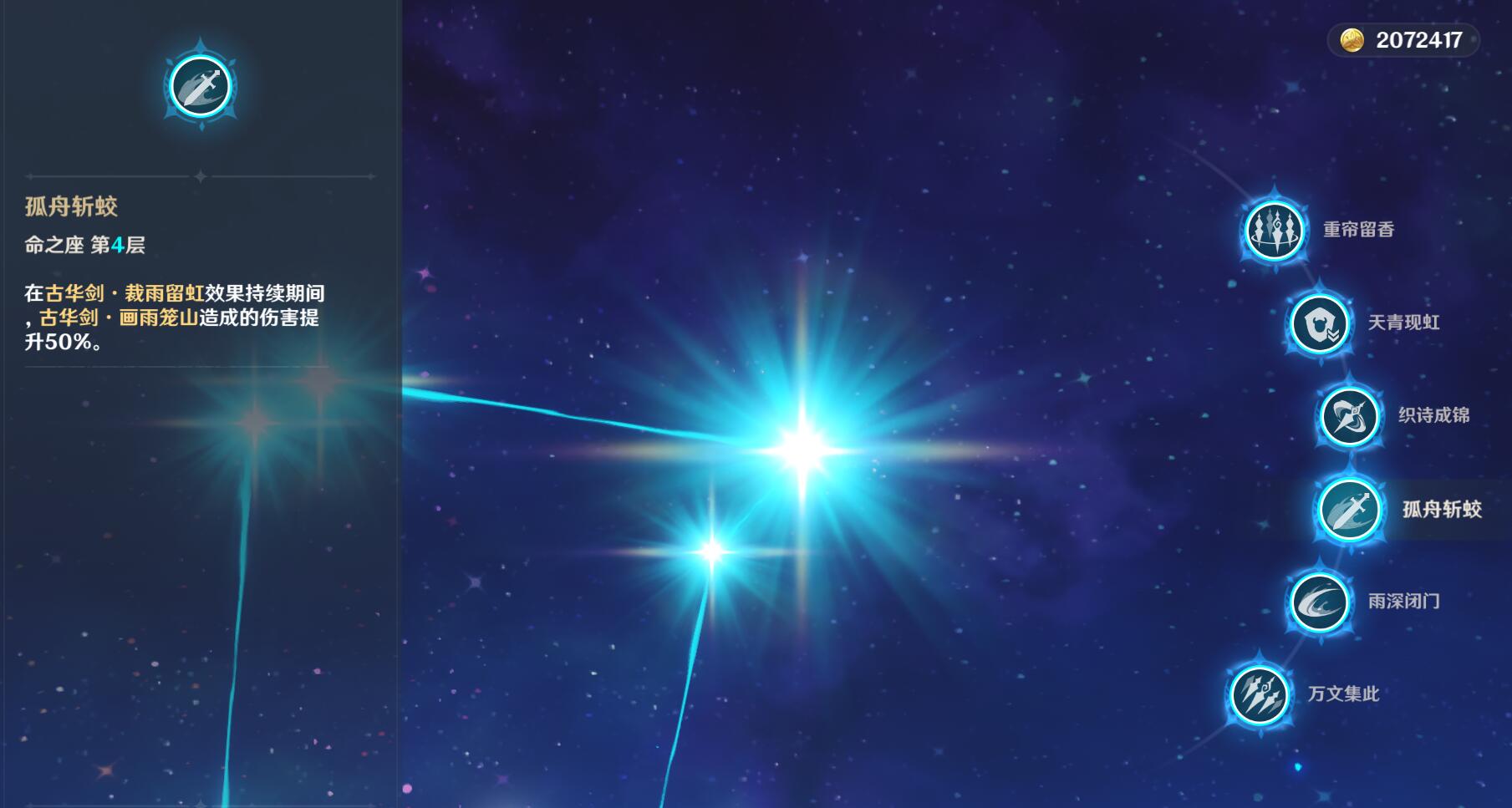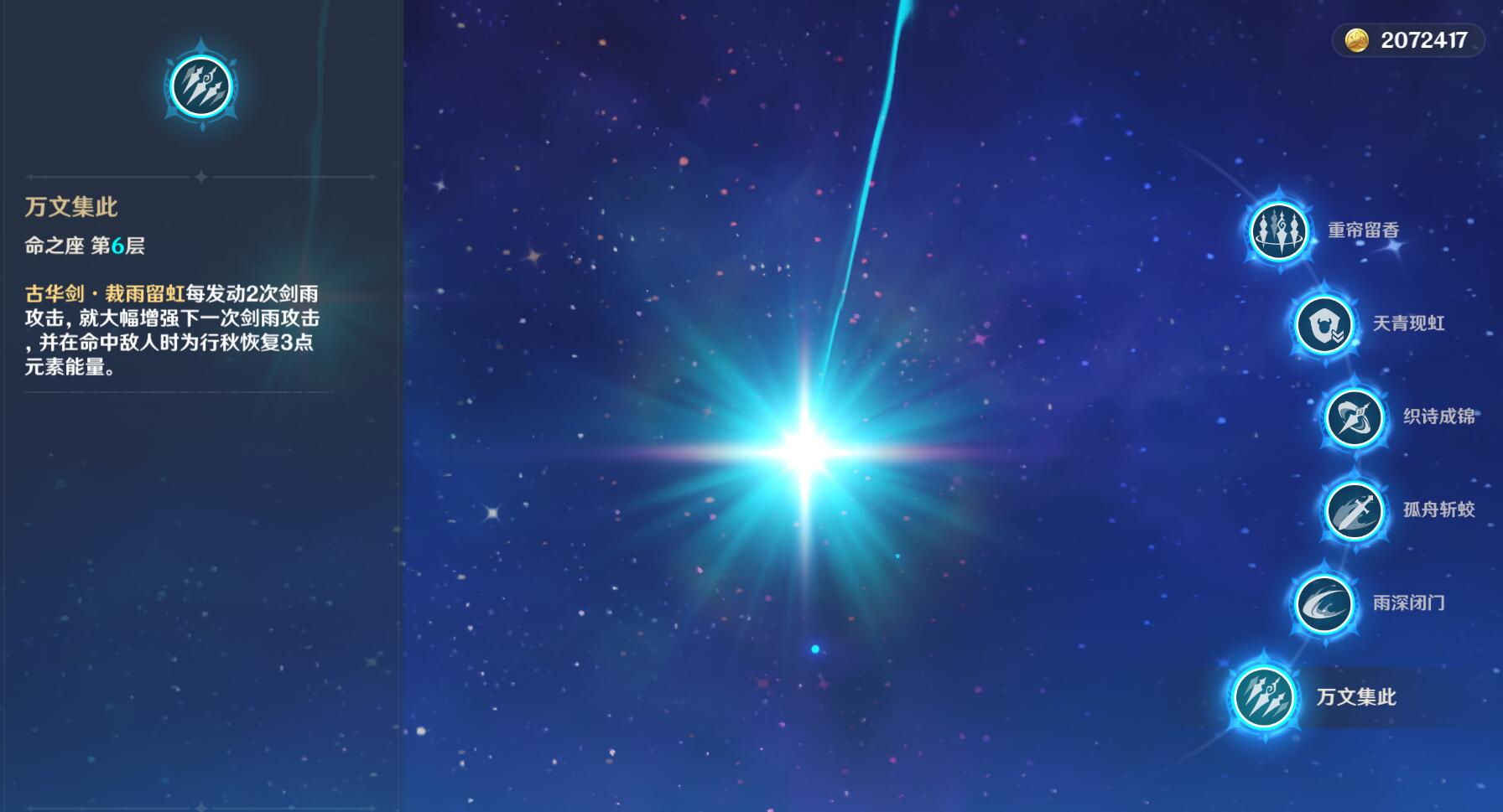 解锁1命,雨帘剑数量从3柄变4柄。解锁2命,大招从15秒延长至18秒,由于加成时间较长,实际游戏中应尽量由行秋先手开大招。这两个命座比较简单,不多说。