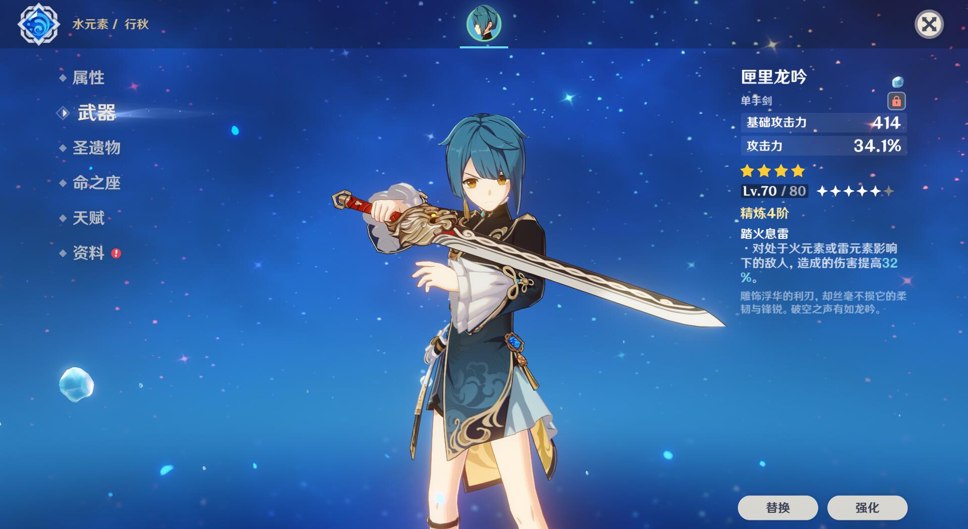 开启E技能生成15秒的雨帘剑,减伤29%,并按行秋水伤加成的20%提供额外减伤,最多24%,想吃满至少需要120%的水伤加成。