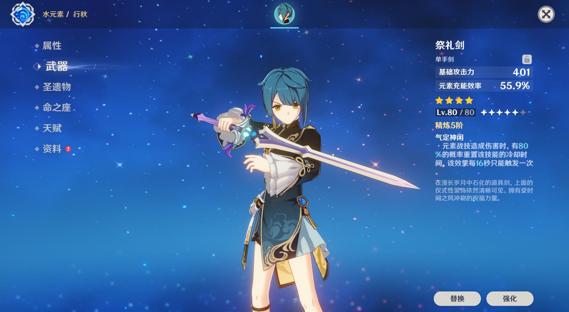 副C流行秋,推荐【祭礼剑】+“绝缘4件套”,攻击沙,水伤杯,暴击帽子。一般来说,元素充能达到200%就已经能够满足大多数场景需求了,但在某些场景下仍然会出现只差3-6点能量开不出大招的尴尬情况。