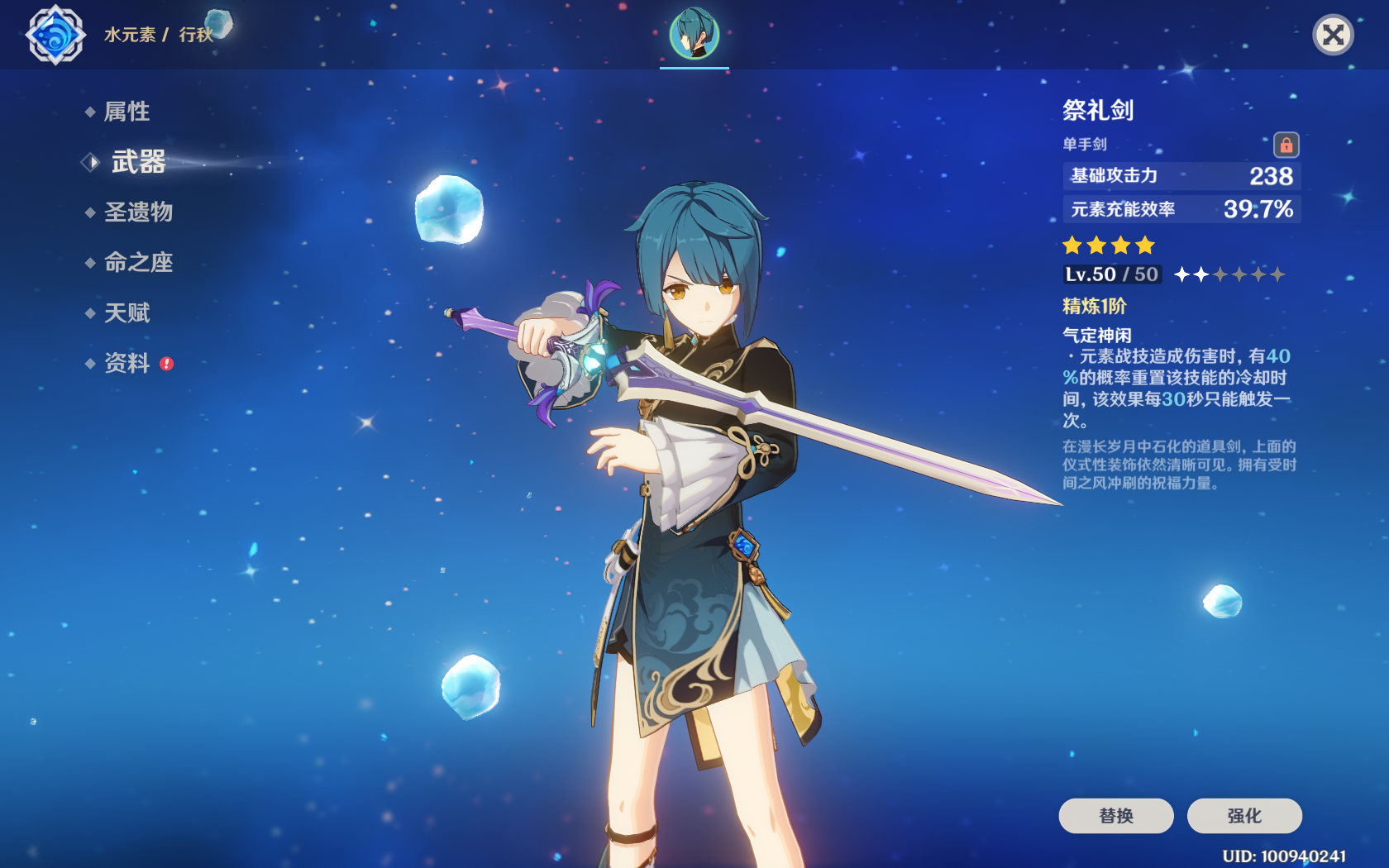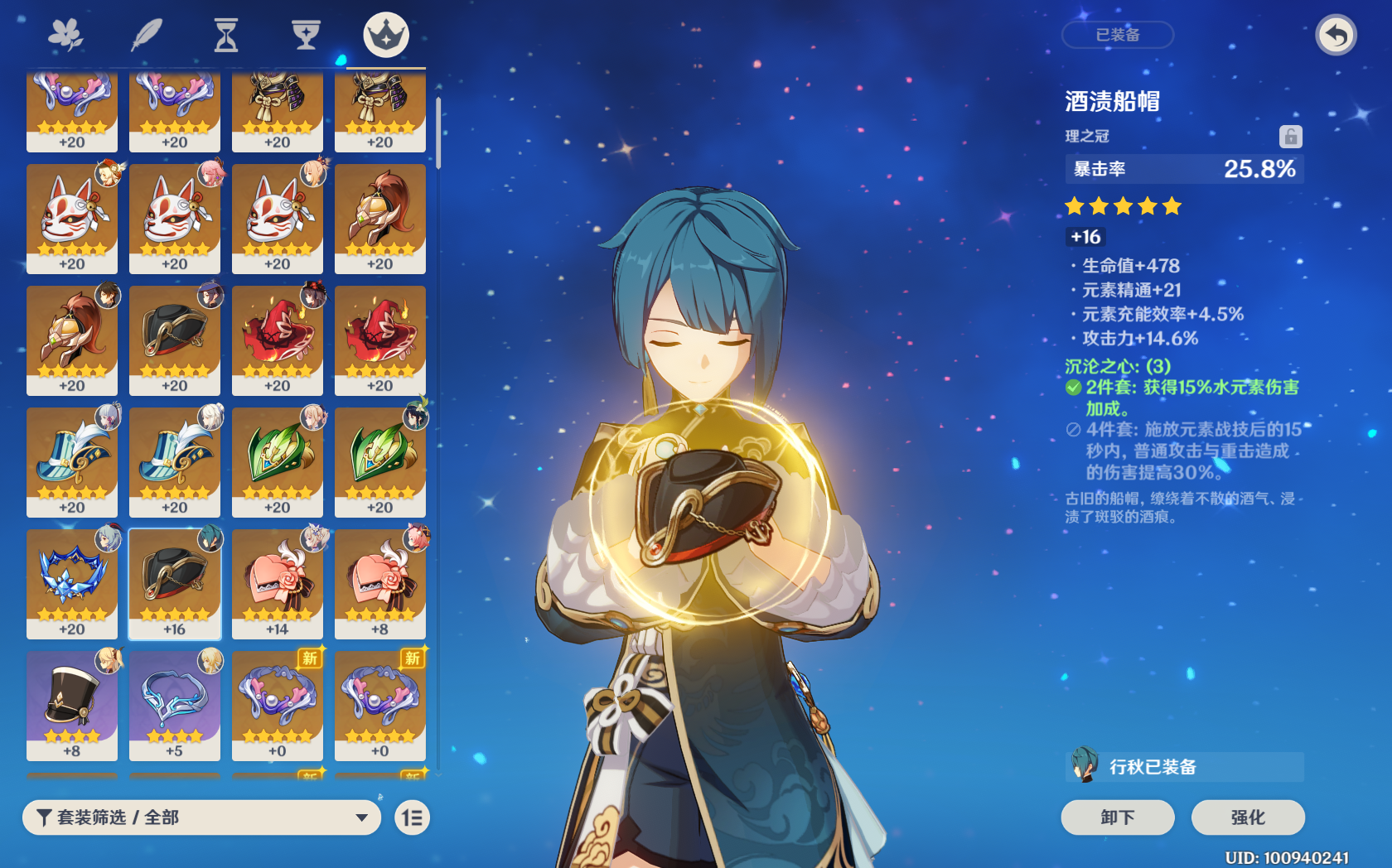 圣遗物:由于不需要行秋直接进行各种攻击,圣遗物以辅助以及增加e和q技能伤害为主。这边推荐2沉沦+2宗室,搭配攻击沙,水伤杯,双暴头;副属性优先级推荐双暴>充能>攻击>精通。