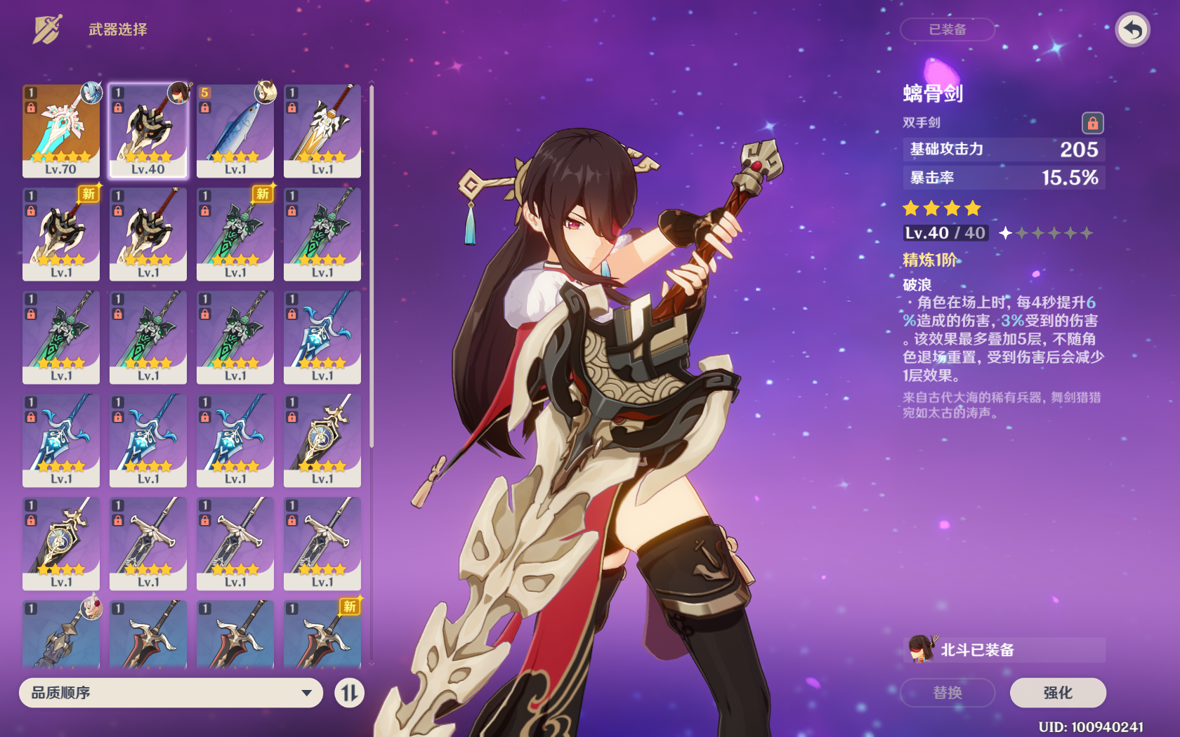 简介:主要装备副属性为元素充能或者暴击的大剑,没有的情况下考虑攻击力,由于自身能产生护盾,歪了的无工之剑也是个不错的选择,一般情况下拿螭骨剑性价比最高,较容易获得。