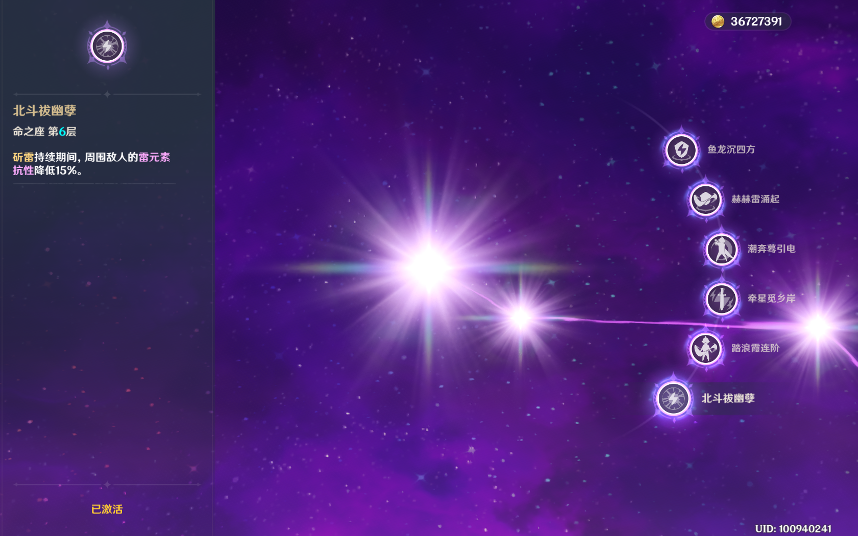 命座:2,4,6为输出关键命座,老手玩家相信有不少已经满命的了,能够最大程度的提升北斗的雷元素伤害,1命能够为北斗释放大招时也丢个盾,虽然只能对雷元素伤害吸收有加成,但是一些需要护盾来触发的装备或技能buff也会更容易许多了。