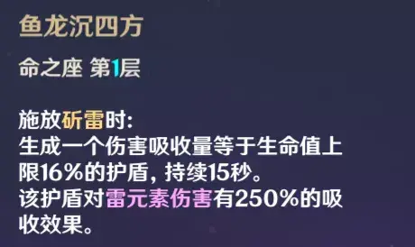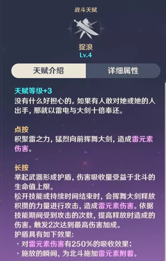(1)长按形成雷元素护盾(雷元素250%吸收),护盾吸收量和北斗生命值上限挂钩,不过无需为此特意去堆北斗生命值。