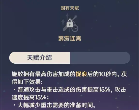 (4)达到最高伤害以后,北斗普攻和重击伤害提高15%,攻击速度提高15%,大幅度减少重击需要的准备时间,该BUFF持续10S。