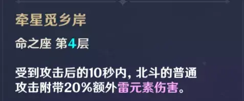 受攻击10S内,北斗普攻附带额外20%雷元素伤害。对于副C北斗来说意义不是很大,因为我们前面说了副C北斗一般不打普攻伤害。